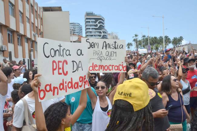 Assim como em várias cidades, manifestantes protestaram neste domingo (21), em Salvador, contra a Proposta de Emenda à Constituição (PEC) da Blindagem e contra o projeto que anistia condenados pelo 8 de Janeiro.