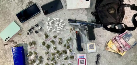 Na ação, foram apreendidos uma pistola calibre .40 com numeração raspada, um carregador, munições, um tablete de 1kg de maconha e 44 porções da erva, além de 59 porções de cocaína, três celulares, uma placa com QR Code usada para a comercialização dos entorpecentes e dinheiro.