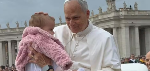 A pequena Maria Gonçalves Lima, de 7 meses, foi escolhida para ser levada ao papa Leão XIV e abençoada por ele em meio a multidão na Praça de São Pedro, no Vaticano, na quarta-feira (22).