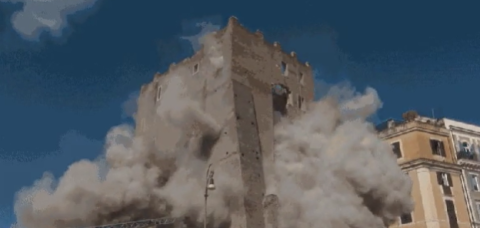 Imagens registravam o trabalho da equipe quando a torre, de 29 metros de altura, começou a tremer. O vídeo mostra então o segundo desabamento, que lançou poeira e destroços nos arredores.